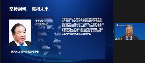 中国汽车工程学会名誉理事长付于武题为《坚持创新,赢得未来》的致辞。