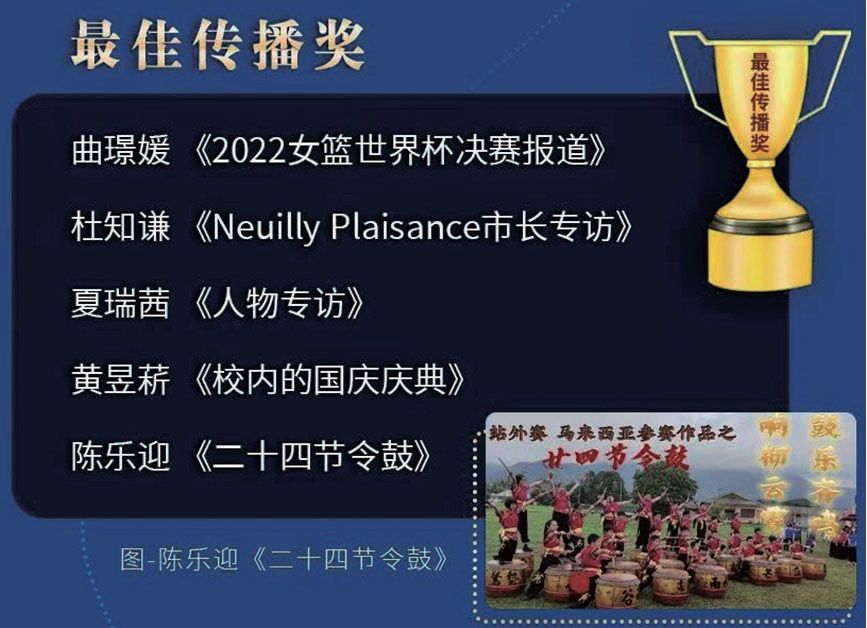 主办方将在近期举办线上颁奖典礼,对获奖机构及参赛人员进行表彰,颁发电子证书。此次比赛中获奖的优秀作品还将在中国华文教育基金会官网、云上华文平台、中国新闻网、中国侨网及其新媒体矩阵进行展示推荐。