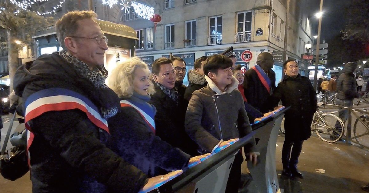 巴黎十九区区长达纽(左一)、副区长王立杰(左三)、十区区长高德芭(左二)、巴黎市议员萨马盖(右二)等嘉宾为美丽城街区点亮圣诞彩灯。