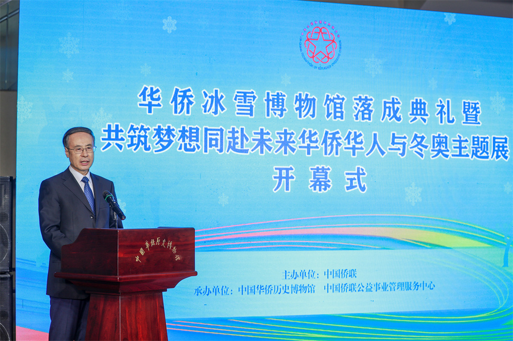 图为中国侨联党组书记、主席万立骏致辞并宣布展览开幕。
