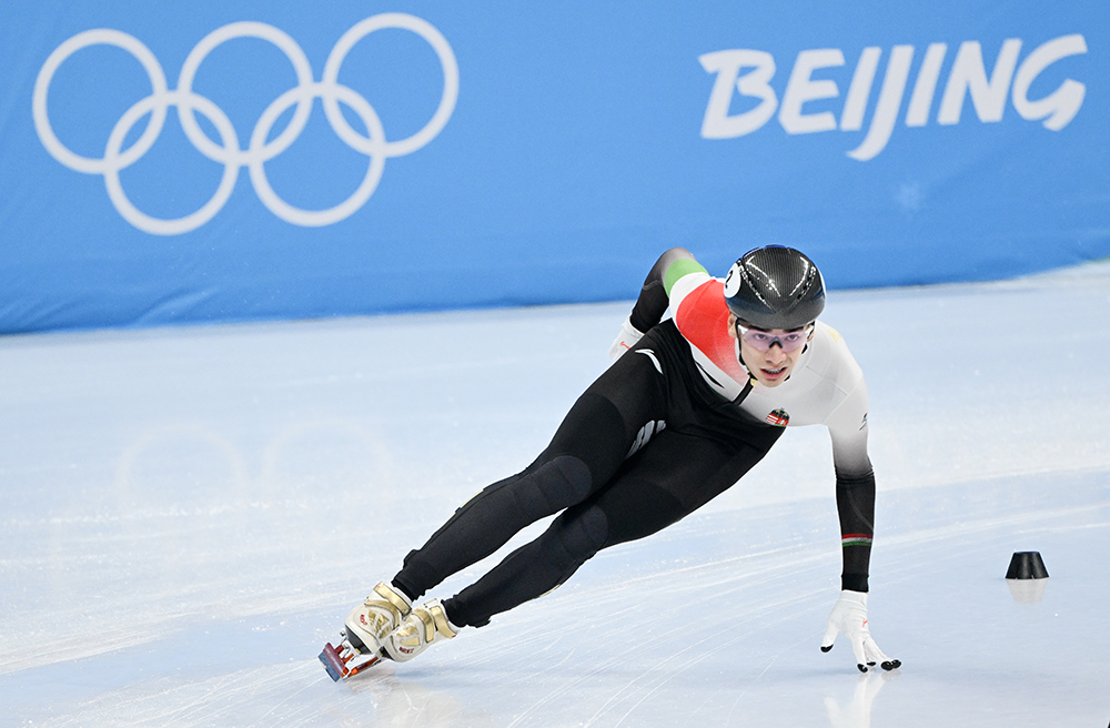 2月9日,北京2022年冬奥会短道速滑项目男子1500米四分之一决赛在首都体育馆举行。图为匈牙利选手刘少林在比赛中。(图片来源:新华社)
