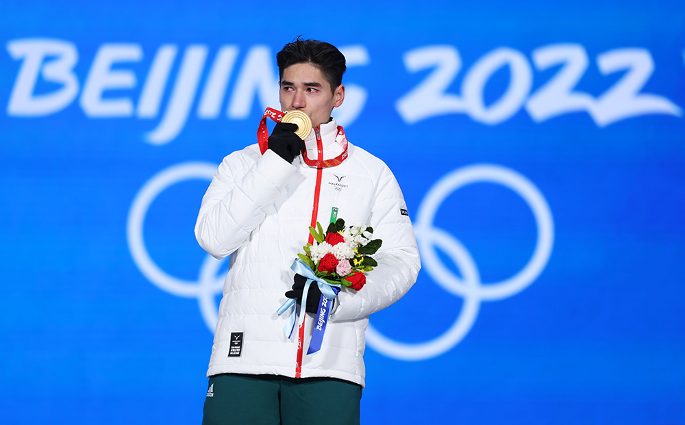 2月14日,北京2022年冬奥会短道速滑项目男子500米奖牌颁发仪式在北京赛区颁奖广场举行。图为冠军匈牙利选手刘少昂在奖牌颁发仪式上。(图片来源:新华社)