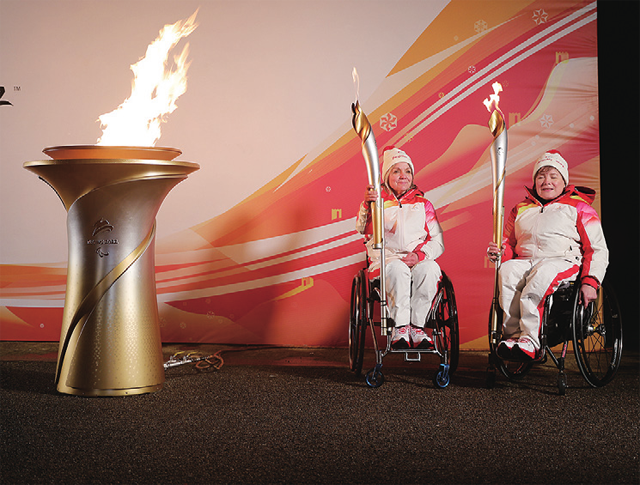 在曼德维尔体育场,两名英国轮椅冰壶运动员手持火炬点燃火种台。