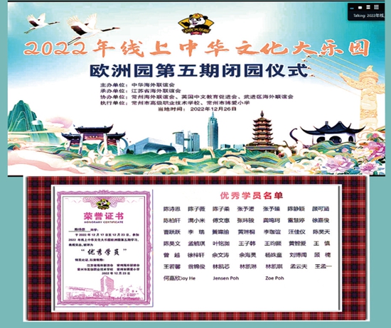 【欧洲时报】历时10天的2022年线上中华文化大乐园——欧洲园第五期举行了闭园仪式。闭园式由本次执行单位之一的常州市博爱小学副校长高洁主持,常州市博爱小学校长柴曙瑛致辞。柴曙瑛介绍了课程主讲老师,感谢所有参与学校的努力,本次文化大乐园的成功体现了海内外华人对中华文化的热爱之情。