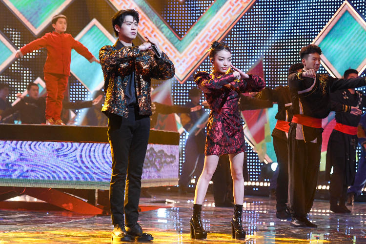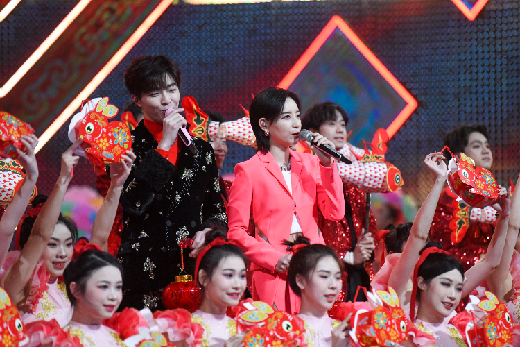 歌手李斯丹妮(右)和陈立农(左)合唱。(图片来源:中新社)