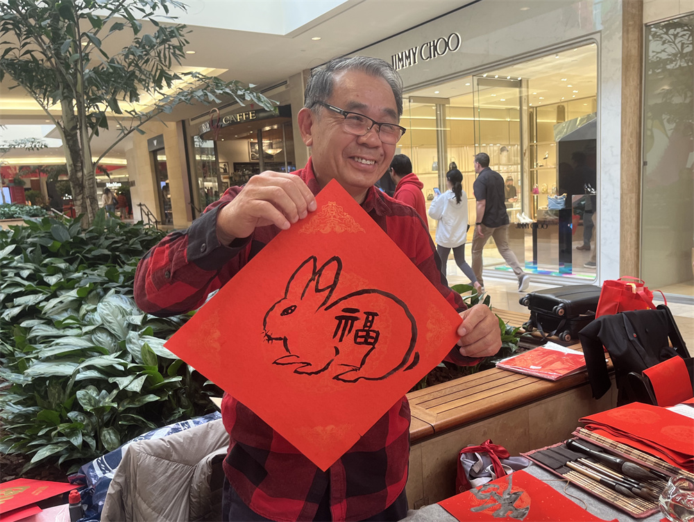 在年画展举办的同时,中国驻洛杉矶总领事馆还邀请了两位来自北美红楼梦研究学会的书法家现场挥笔泼墨,送春联、赠福字,吸引众多观众感受中国书法的魅力和过年的欢乐。