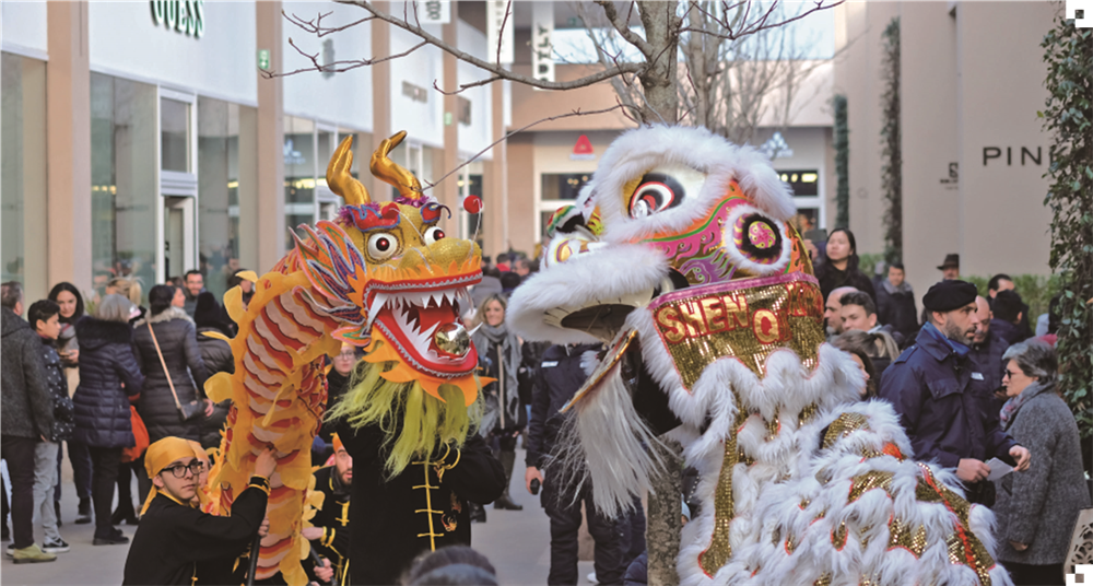 图为佛罗伦萨华星艺术团联盟成员龙狮团队在都灵奥特莱斯村中国文化年活动上舞龙狮。(图片来源:受访者供图)