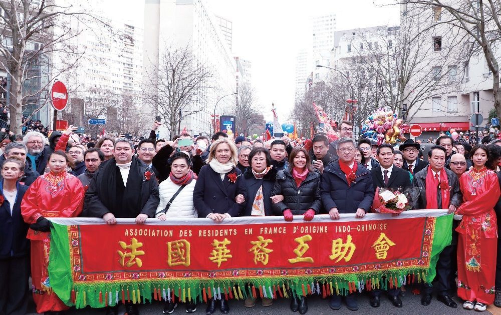 中国驻法大使馆陈栋公使、巴黎市长伊达尔戈、巴黎大区议长佩克雷斯、巴黎十三区区长顾梅等中法政要走在队伍的前列。