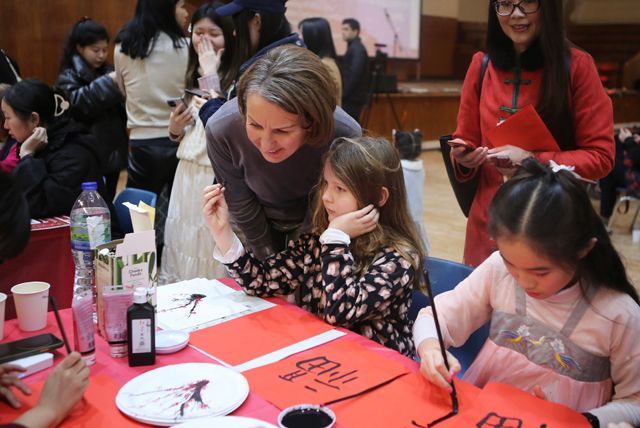 当地观众体验“写福字”。(图片来源:欧洲时报实习记者朱若溪 摄)