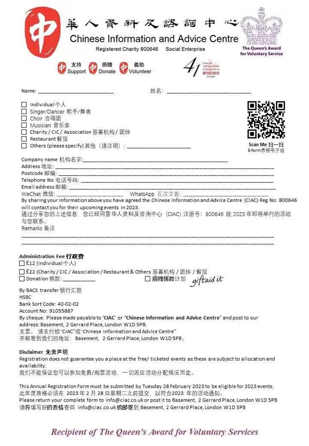 杨庆权表示,CIAC同仁在新一年将继续竭诚为华社服务,也将组织更多和英国主流社会和机构的活动。他也竭诚欢迎大家与CIAC登记(注册表格见下图),“无论你是可以作为志愿者服务,想参与接下来的各种活动,或者是寻求咨询帮助,都可以和我们来登记。每个人作出一点努力,将使得华社和社会作出更多改变!”