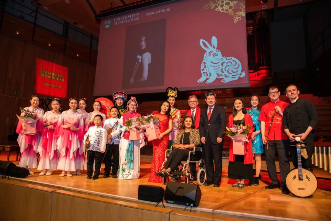 与所有演出人员合影。(图片来源:驻英使馆文化处、伯明翰大学中国学院)