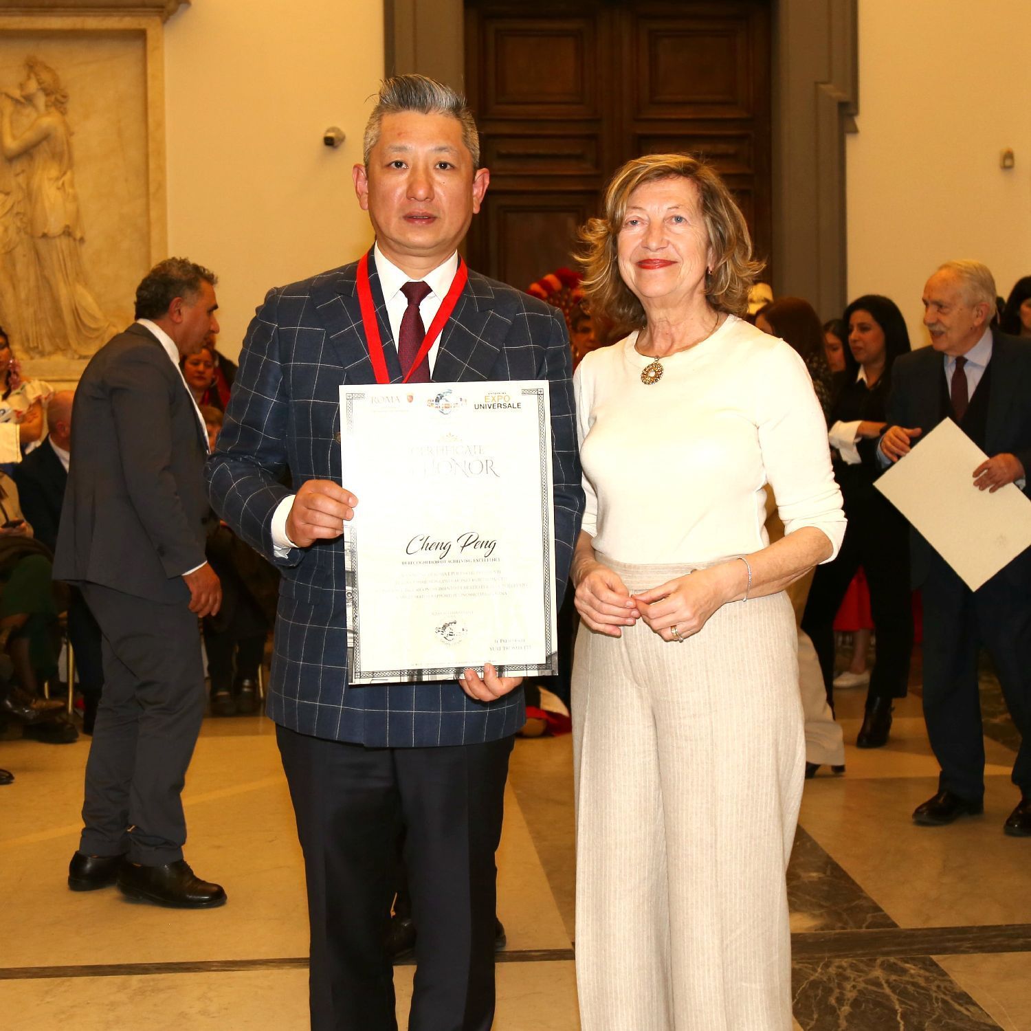 罗马华侨华人联合总会执行会长、白帝国际旅游文化促进会理事长、WIO(意大利世界国际组织)名誉主席程鹏应邀出席了本次发布会,罗马市政府九区区长缇蒂·迪·萨尔沃为程鹏颁发了卓越的意中经贸企业家贡献荣誉证书,以表彰他长期以来为促进中意两国文化,经贸等领域的交流与发展所做出的贡献。
