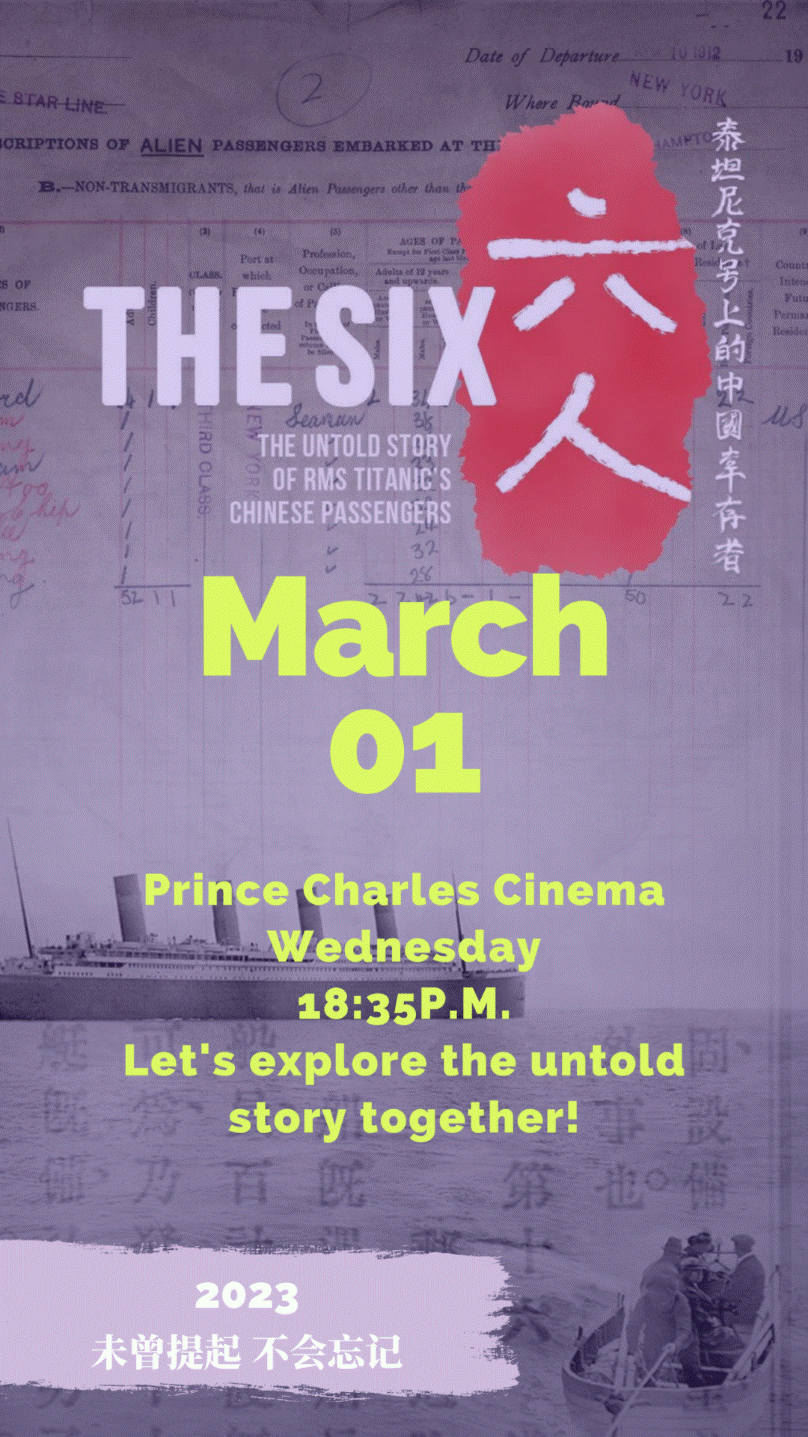 《六人》(2021)由英国导演罗飞与历史学者施万克,带领研究团队,耗时6年,前往全球20多个城市拍摄完成,讲述了1912年4月14日泰坦尼克号上鲜为人知的中国人的故事。遇难后,所有幸存者被送至纽约港口得到安置,而六名中国幸存者,在获救后24小时之内则被美国驱逐出境。