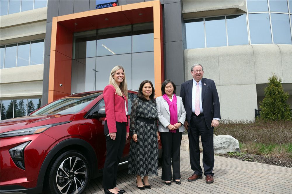当地时间2022年5月6日,美国贸易代表戴琪(右二),与加拿大国际贸易、出口促进、小企业及经济发展部长伍凤仪(右三)在多伦多走访通用汽车公司的技术中心。(图片来源:中新社)