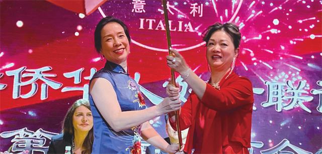 随后,林剑秋郑重地将米兰华侨华人妇女联谊总会会旗和会印交到第七届会长余小叶手中,这也标志着米兰华侨华人妇女联谊会开启了新的篇章。