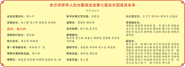 余小叶说,米兰华侨华人妇女联谊总会自成立以来秉持“自尊、自爱、自立、自强”的巾帼精神,积极努力地发展会务工作,服务侨胞,维护女性同胞的合法权益,为米兰侨社的精神文明建设贡献了自己的力量,撑起了女性同胞的半边天。