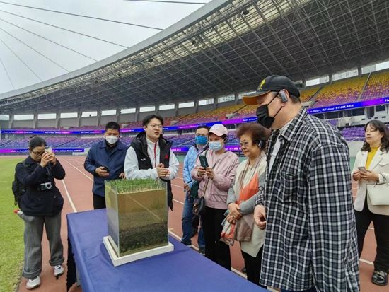 工作人员向记者们介绍道:“为服务杭州亚运会,从2020年1月开始,黄龙体育中心进行了全方位的升级改造。改造后的足球场使用了国际上最先进的锚固草坪,这种草坪通过将自然草坪与人造草纤维结合,能使其更牢固,使用后的恢复能力也更强,在中国南方这可是第一块。”