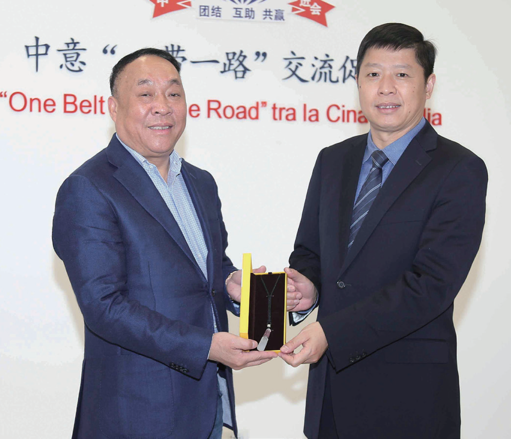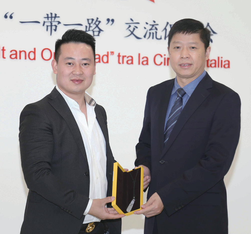 朱兴波副市长向米兰市前副议长Stefano Di Martino赠送纪念品。