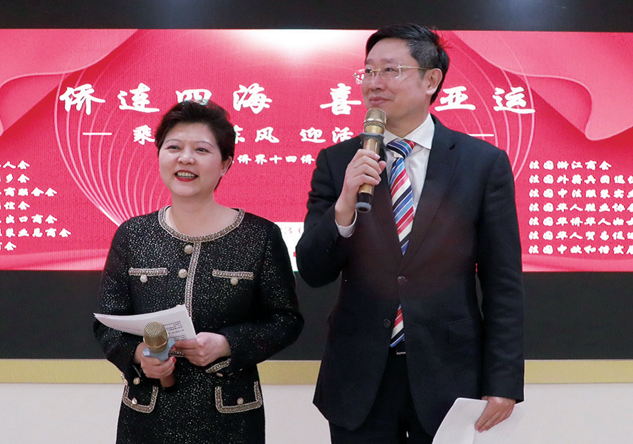 法国华侨华人妇女联合会会长陈岚与法国文成联谊会会长刘小慧主持当晚的活动。他们表示,亚运会是盛大的国际体育赛事,旅法侨界代表积极参与本次交流活动,共同期待中国体育代表团在这届亚运会上展现实力,为国争光。虽然我们身处异国他乡,但我们的心依旧牵挂着祖国。怀着对祖国的深深眷恋和热爱,为这项赛事而自豪和兴奋。两位主持人介绍说,本次活动可谓一呼百应,众多旅法侨界代表都积极参与本次活动,在场的每一位,都是中国文化的传承者和推广者。让我们以“乘亚运东风,迎活力浙江”的口号为引,为即将到来的亚运会而努力。