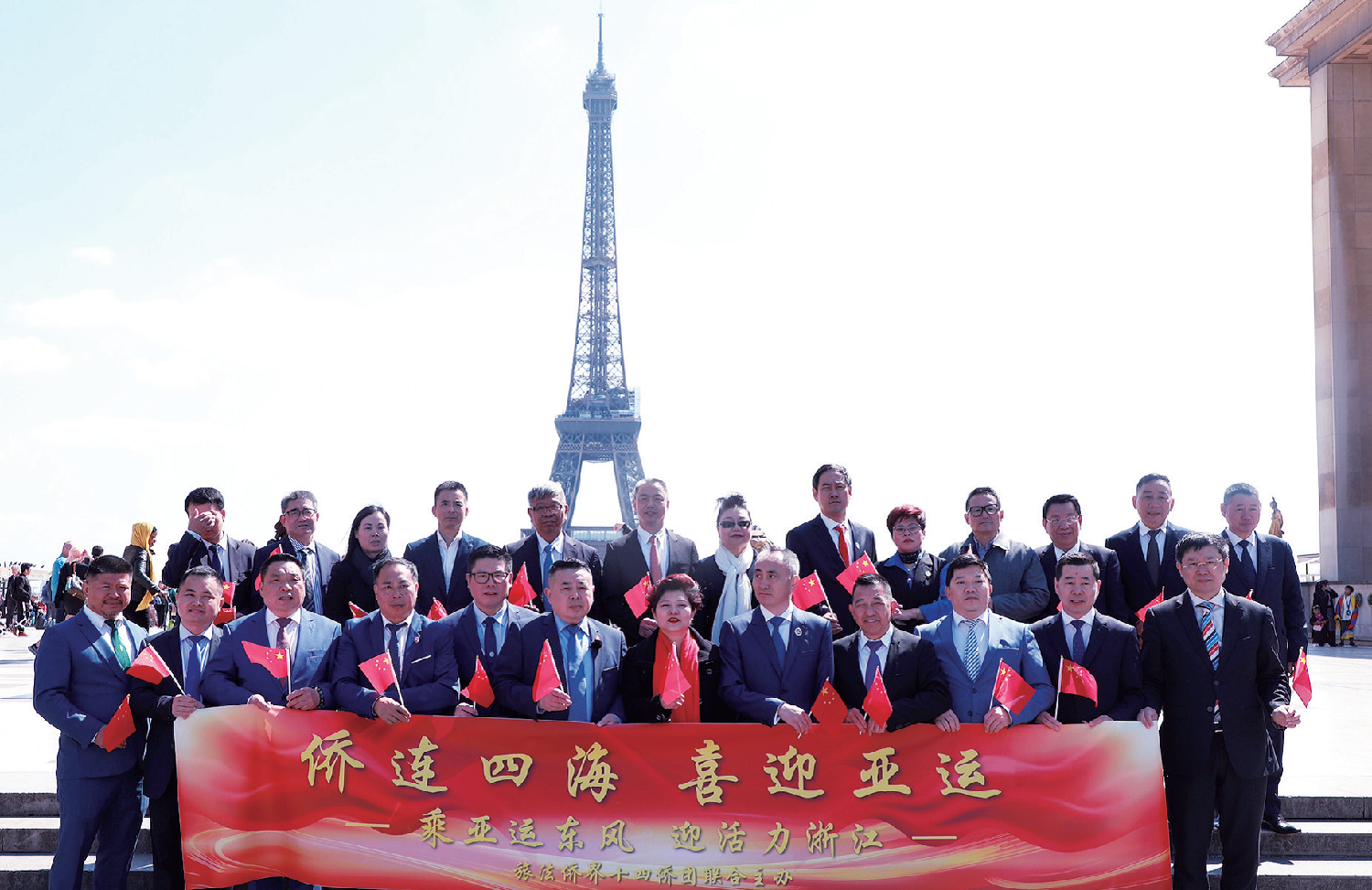 欧洲时报视频组在埃菲尔铁塔下为旅法侨界代表录制了预祝杭州亚运圆满成功的专题片。