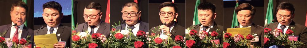 从左至右:意大利华商总会会长洪森淼代表侨界讲话;执行会长詹伟杰宣读全国人大华侨委员会发来的贺电;秘书长叶意里宣读中国侨联发来的贺电;第一常务副会长黄建勇宣读欧洲侨团发来的贺电;理事长徐达宣读中国国内发来的贺电;监事长王峰宣读意大利侨团发来的贺电;监事长王晓龙宣读第四届会长团成员名单;理事长陈伟宣读赠送花篮名单。