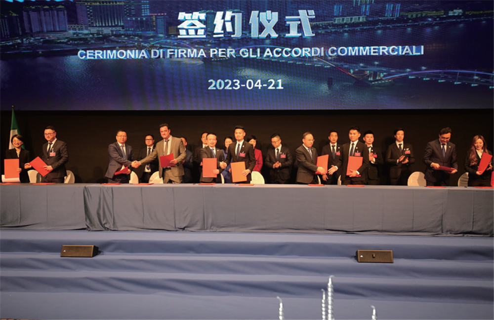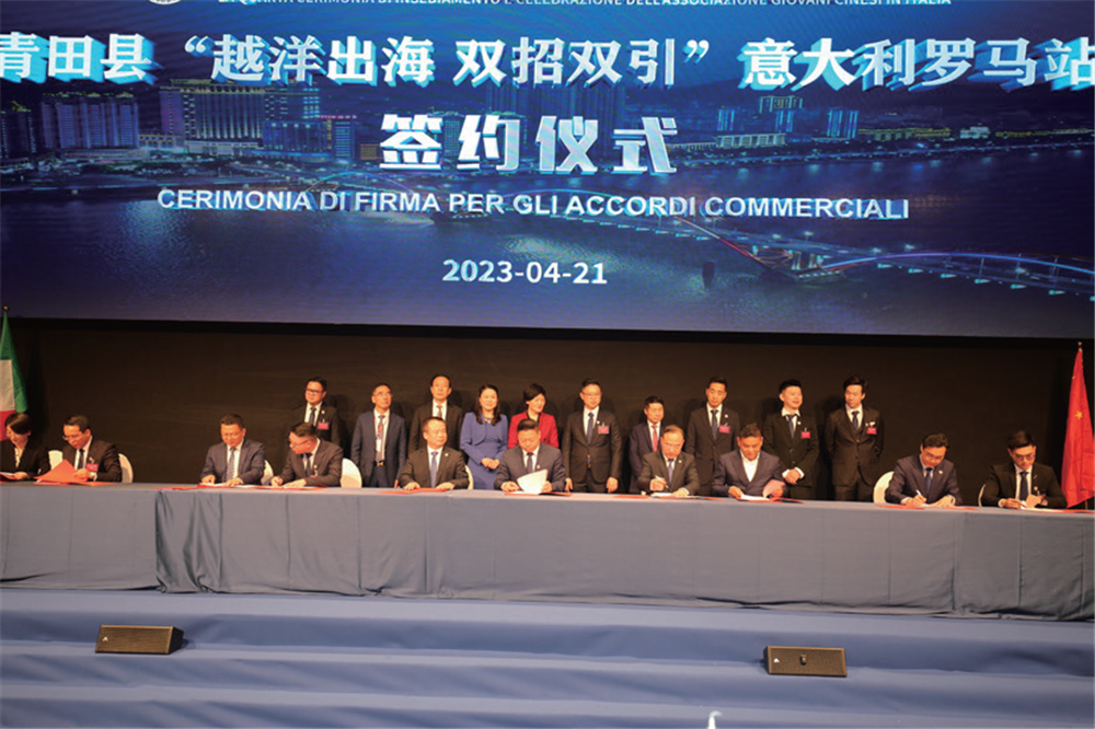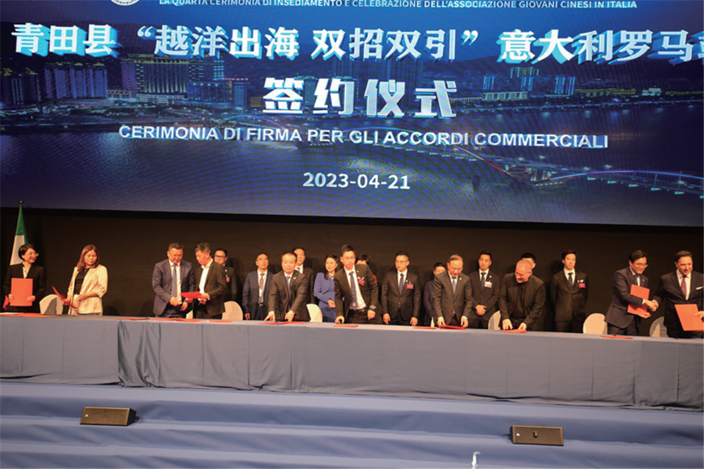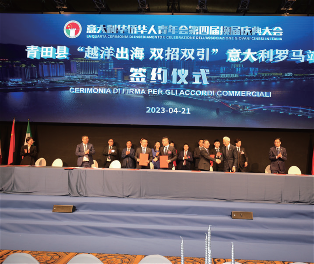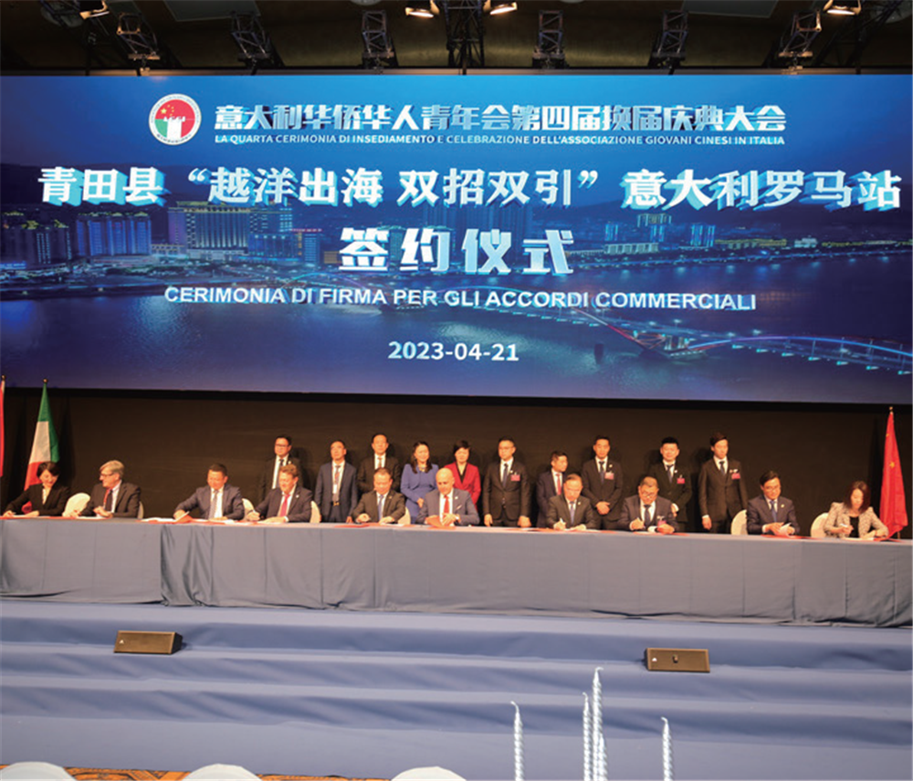 在庆典活动仪式前,青田县委书记林霞作了招商推荐会演讲,随后举行“越洋出海双招双引”意大利罗马站签约仪式。换届庆典由青年会秘书长吴康敏与知名主持人周末共同主持。第三届会长曾步锋做会务总结,他说,8年来青年会热心为侨界同胞服务,积极为祖(籍)国企业与住在国企业沟通与交流铺路搭桥。当罗马华人区治安恶化时,通过多方协调,青年会与当地警方合作,建立了全意大利第一支警民合作治安巡逻队。为了弘扬中华文化,发挥青年人的激情与活力,青年会资助成立了意大利华人历史上第一支龙舟队,这支龙舟队获得过多次联赛冠军。在维护华侨华人合法权益上,青年会号召组织了过万人的“反暴力”大游行,在团结和谐侨社工作中,青年会踊跃参与侨界各种活动,成功协办罗马侨界第一届、第二届春节庙会活动。在多次大型接待工作中,青年会都能圆满完成受分配任务。疫情期间,全体会员团结努力,为同胞服务,帮助大家抗击疫情。总结的最后,他向所有对青年会发展做出帮助与支持的各界人士表示感谢,并祝愿新一届会长团在徐磊的带领下更加充满活力,会务蒸蒸日上。
