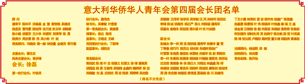 徐磊还表示,“青年”两个字不仅是我们最鲜明的标识,也是我们最大的优势,我一定要凝聚全体会员的力量,勇往直前,努力推动中意两国优秀青年企业家的交流与合作,为两国的发展贡献力量。希望社会各界能一如既往的给予支持,青年会将始终牢记创会宗旨和时代使命,奋发向上,爱国爱乡,积极参与“一带一路”建设,在不断适应新形势的同时,努力开拓意大利华侨华人青年会工作的新局面。