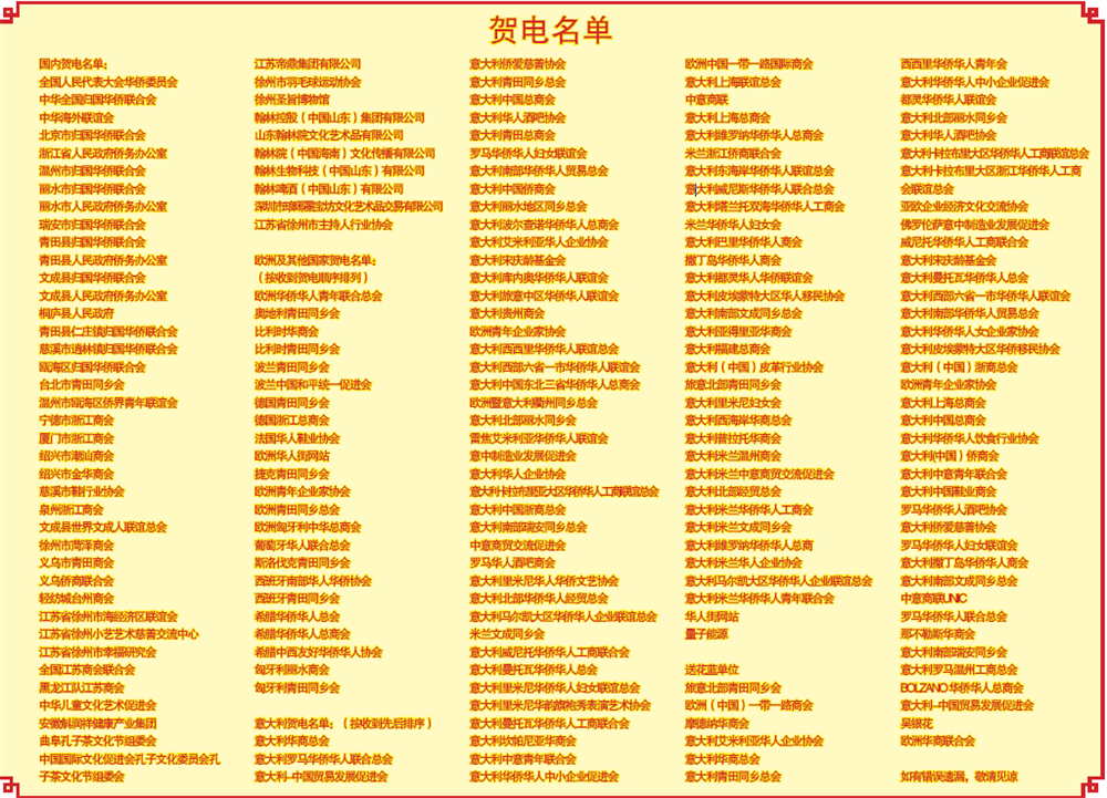 讲话环节结束后,执行会长詹伟杰宣读全国人大华侨委员会发来的贺电,秘书长叶意里宣读中国侨联发来的贺电,第一常务副会长黄建勇宣读欧洲各侨团发来的贺电,理事长徐达宣读国内发来的贺电,监事长王峰宣读意大利各侨团发来的贺电,监事长王晓龙宣读第四届会长团成员名单,理事长陈伟宣读赠送花篮名单。
