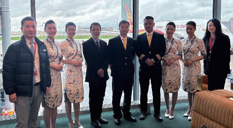 海航巴黎办事处总经理李亮(左4)与机组人员、工作人员在登机口现场。孔帆摄