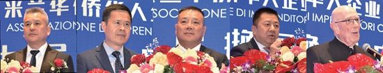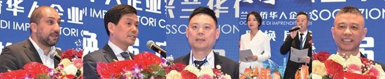 从左至右分别为新一届会长陈金隆发表就职讲话,中国驻米兰总领事馆副总领事张凯斌发表讲话,上一届会长徐建平作会务工作总结,温州市侨联副主席董邦云发表讲话,意中基金会BOSSELLI博士致辞。