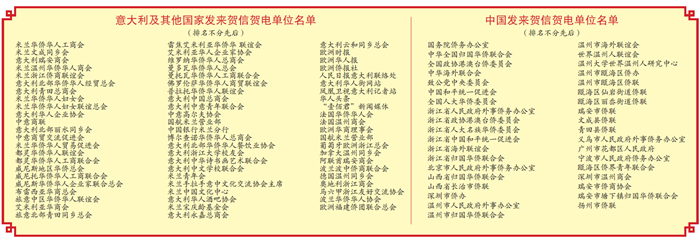 讲话结束后,理事长张松波宣读了理事会主要成员名单,执行会长刘志静宣读了中华海外联谊会发来的贺电,执行会长李春文宣读了中国侨联发来的贺电,监事长谢海春宣读了全国人大华侨委员会发来的贺电,第一常务副会长陈云洲宣读了国内发来贺电的名单,会长助理蔡焱晟宣读了欧洲及海外发来贺电的名单。