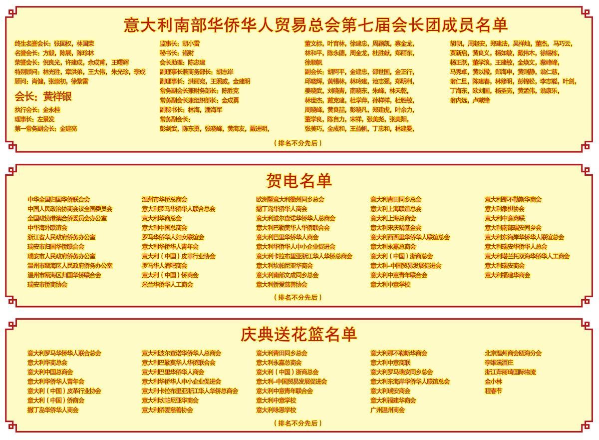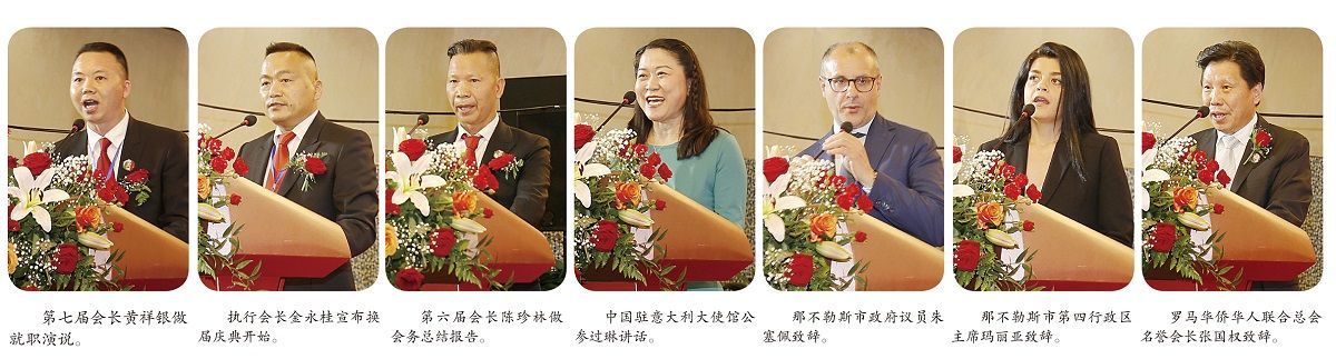 接着,那不勒斯第四行政区主席玛丽亚,意大利罗马华侨华人联合总会名誉会长张国权,意大利华商总会会长洪森淼,意中佛教文化交流协会会长林国荣,意大利(中国)浙商总会会长焦国林,也纷纷致辞对意大利南部华侨华人贸易总会成功换届及黄祥银荣任新一届会长表示祝贺。
