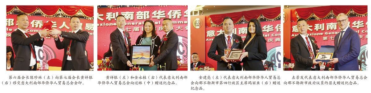 【欧洲时报实习记者风海那不勒斯图文报道】5月27日,意大利南部华侨华人贸易总会在那不勒斯新王朝大酒店举行换届庆典仪式,新一届会长团由黄祥银荣任第七届会长,金永桂荣任执行会长,金建亮荣任第一常务副会长,左景发荣任理事长,胡小雷荣任监事长,诸财荣任秘书长,陈建忠荣任会长助理。中国驻意大利大使馆公参过琳,那不勒斯市政府议员朱塞佩·本奇文加(Giuseppe Bencivenga),那不勒斯第四行政区主席玛丽亚·卡尼格利亚(Maria Caniglia),以及意大利兄弟侨团代表出席了活动。
