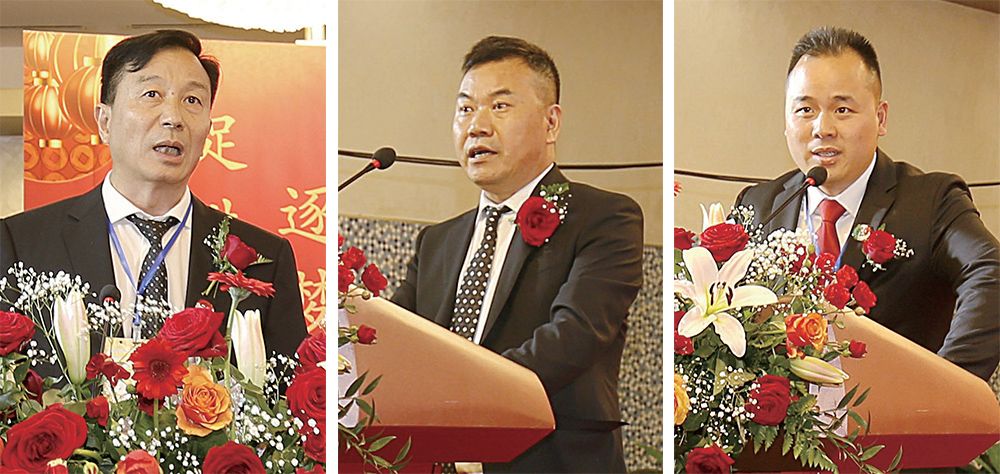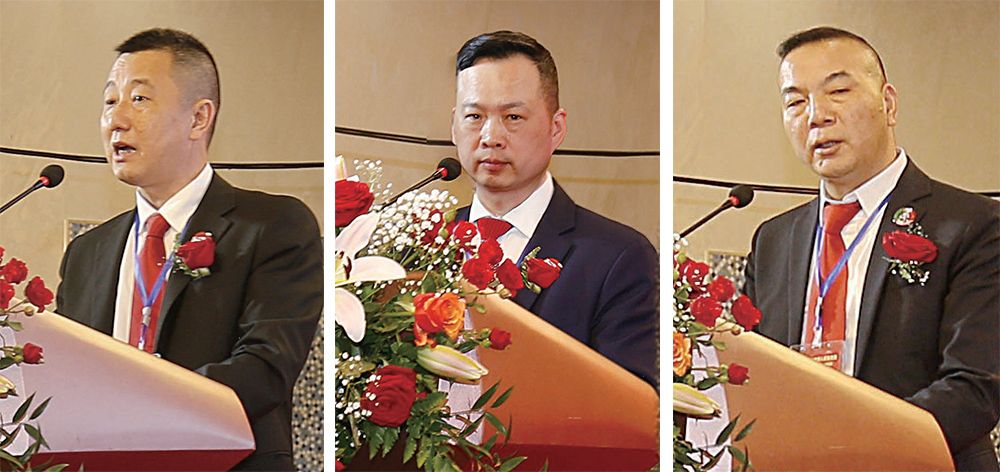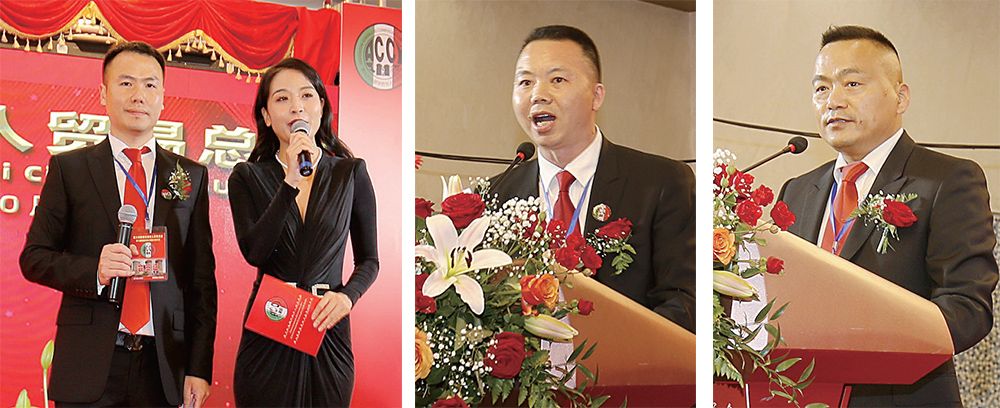 意中佛教文化交流协会会长林国荣致辞(左)。意大利(中国)浙商总会会长焦国林致辞(中)。第一常务副会长金建亮宣读会长团成员名单(右)。