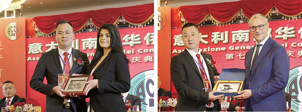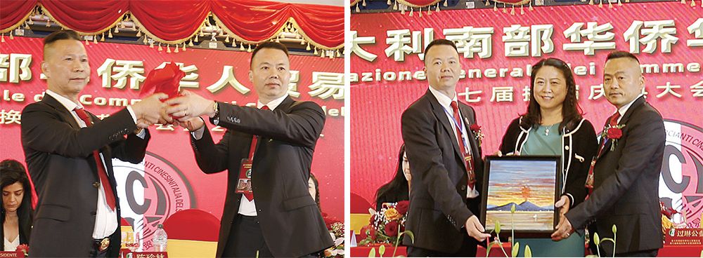 第六届会长陈珍林(左)向第七届会长黄祥银(右)移交意大利南部华侨华人贸易总会会印(左图)。黄祥银(左)和金永桂(右)代表意大利南部华侨华人贸易总会向过琳(中)赠送纪念品(右图)。