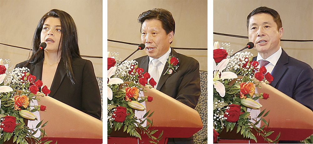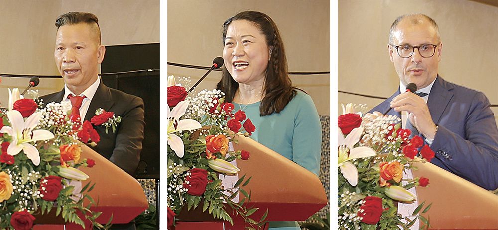 那不勒斯市第四行政区主席玛丽亚致辞(左)。罗马华侨华人联合总会名誉会长张国权致辞(中)。意大利华商总会会长洪森淼致辞(右)。