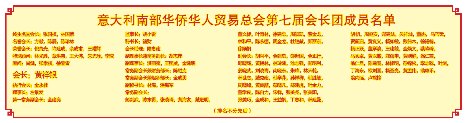 【欧洲时报实习记者风海那不勒斯图文报道】5月27日,意大利南部华侨华人贸易总会在那不勒斯新王朝大酒店举行换届庆典仪式,新一届会长团由黄祥银荣任第七届会长,金永桂荣任执行会长,金建亮荣任第一常务副会长,左景发荣任理事长,胡小雷荣任监事长,诸财荣任秘书长,陈建忠荣任会长助理。中国驻意大利大使馆公参过琳,那不勒斯市政府议员朱塞佩·本奇文加(GiuseppeBencivenga),那不勒斯市第四行政区主席玛丽亚·卡尼格利亚(MariaCaniglia),以及意大利兄弟侨团代表出席了活动。