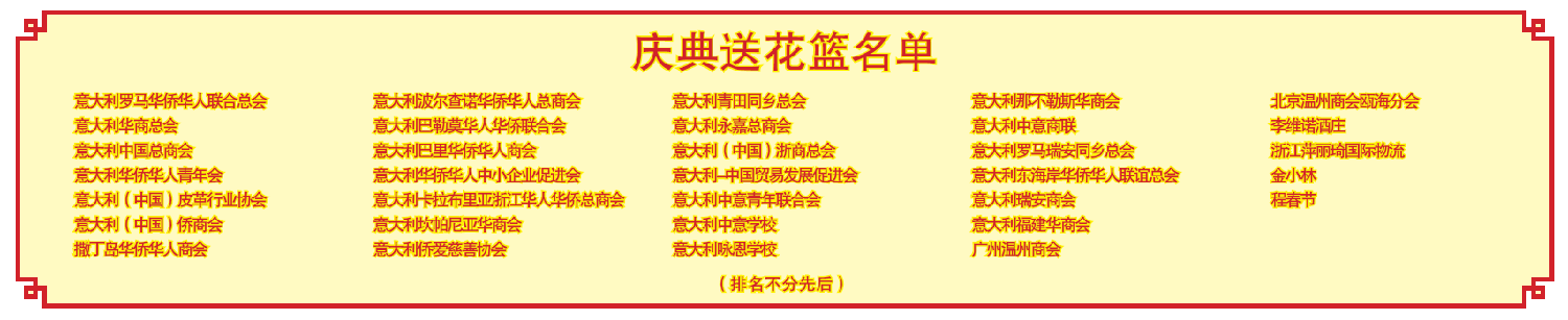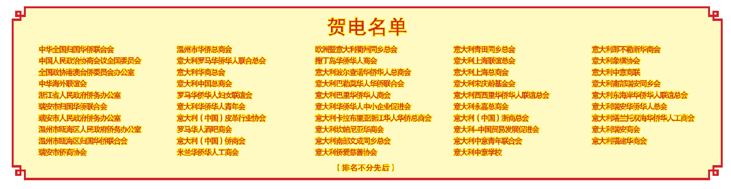 接着,那不勒斯第四行政区主席玛丽亚,意大利罗马华侨华人联合总会名誉会长张国权,意大利华商总会会长洪森淼,意中佛教文化交流协会会长林国荣,意大利(中国)浙商总会会长焦国林,也纷纷致辞对意大利南部华侨华人贸易总会成功换届及黄祥银荣任新一届会长表示祝贺。