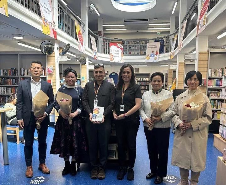 当天下午阳光明媚,清爽怡人。查宁阁图书馆洋溢喜庆气氛。馆长艾特尔.昆塔纳(Aitor Quintana),外联干事希格丹姆.加娜(Cigdem guner)等人热情迎接,鲜花相赠。美好生活读书会负责人、王俊芳、宽广、明持等一行人代表广大书友出席赠书仪式,向伦敦查宁阁图书馆(Charing cross library)赠送在今年4月18日伦敦国际书展上广受关注的中国作家盛蕾新书《我的博物馆》。