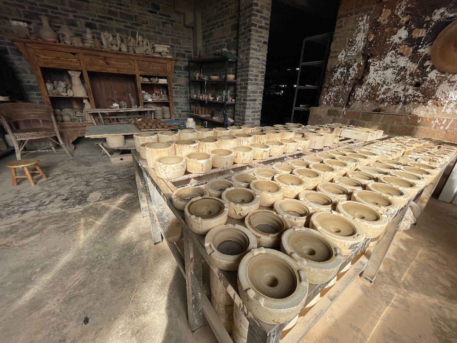 制作绿陶产品,首先要选用会理当地的天然泥巴,晒干后加入白砂石、黏土,再加水拌匀制成浆,干燥后而得坯泥。坯泥可用来制作各种器物,如茶杯、陶罐、酒具等。图为干燥中的泥胚。