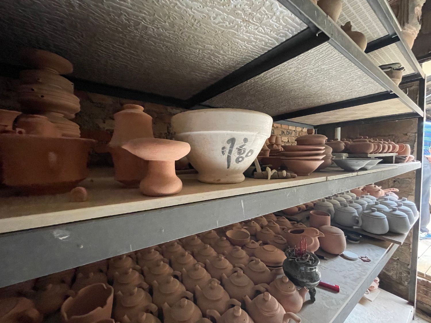 经过修坯、脱坯,就可把釉上到坯上,完后入窑烧制。每一窑都采用超过1230℃的高温烧制,经过50小时的烧制,即可出炉,出炉后的产品主色为“绿、红、黄”。图为陶器半成品。