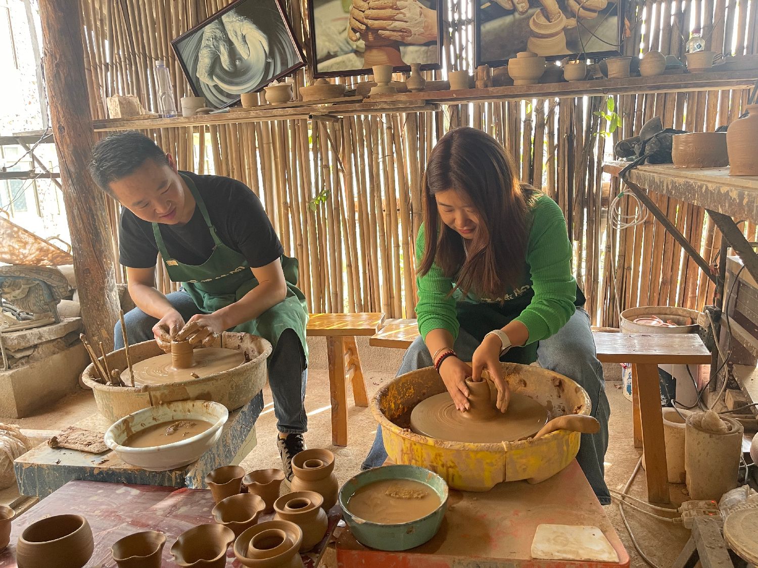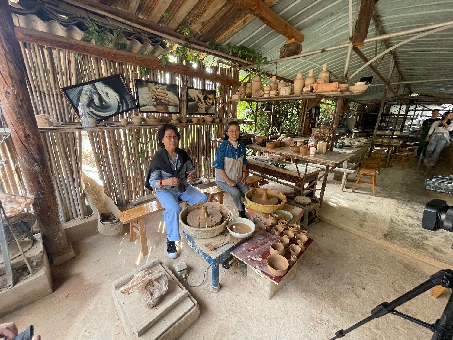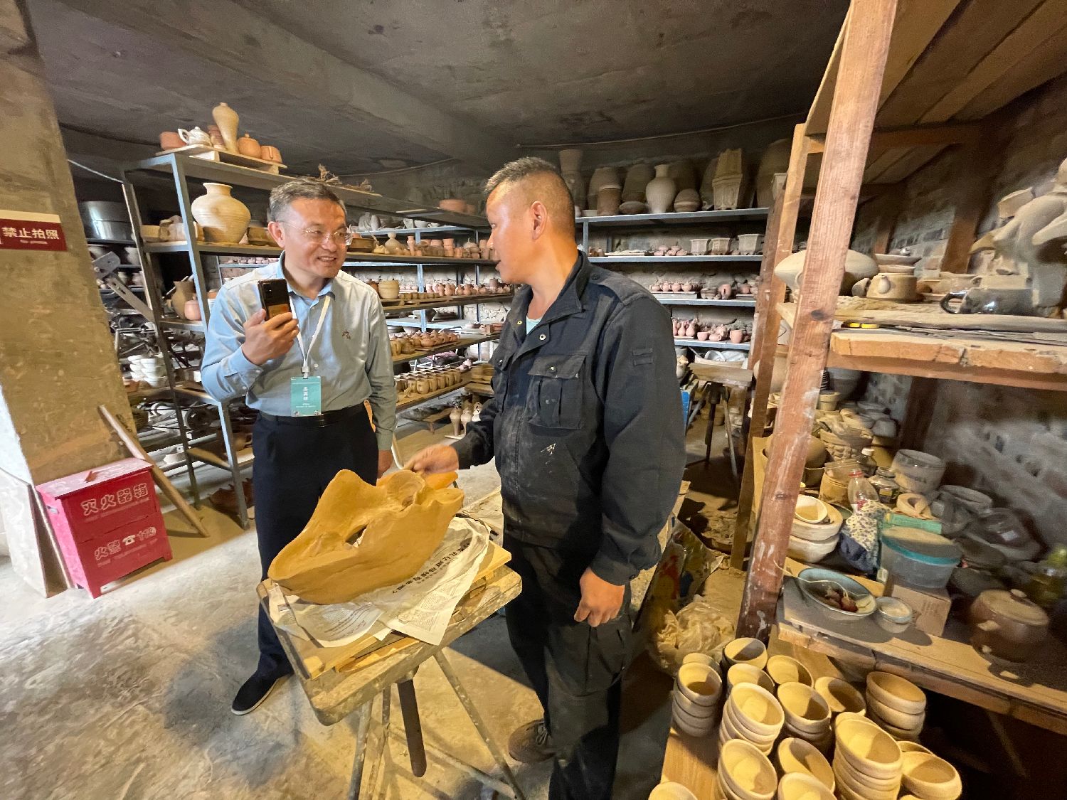 除了可以感受古老的绿陶艺术,园内也可以亲手体验制作。2021年,会理成功建成省级非遗扶贫工坊“会理绿陶非遗扶贫工坊”,每年接待游客和专家近9万人次。图为海外华媒代表体验制作绿陶。