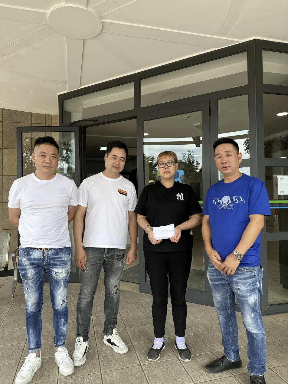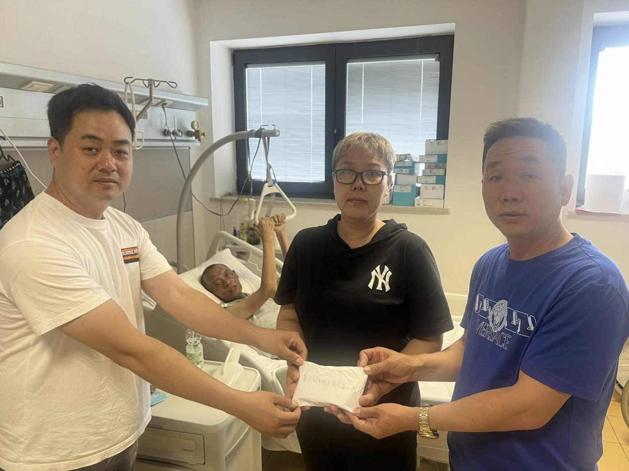 危难之时,胡晓峰想到了向意大利中国总商会求助,意大利中国总商会相关人员在得知这一情况后便立刻行动起来,为胡晓峰夫妇筹集到了8000欧元的应急款项。6月29日,执行会长林建芬,第一常务副会长程素克,秘书长黄新华,财务长戴志广前往医院将这笔救急款送到了胡晓峰夫妇手中,为他们带去了一丝希望和温暖。