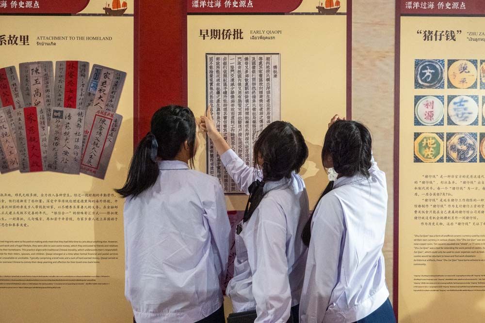 展览共展出120幅图文展板、200余件实物展品和侨批主题影音内容及文创产品。图为泰国青少年学生观展。(图片来源:中新社)