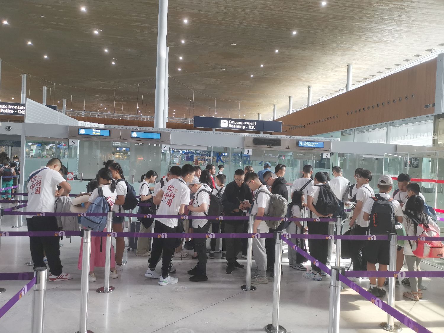 2023“你好中国”法国华裔青少年夏令营全体成员在巴黎戴高乐机场集结出发。