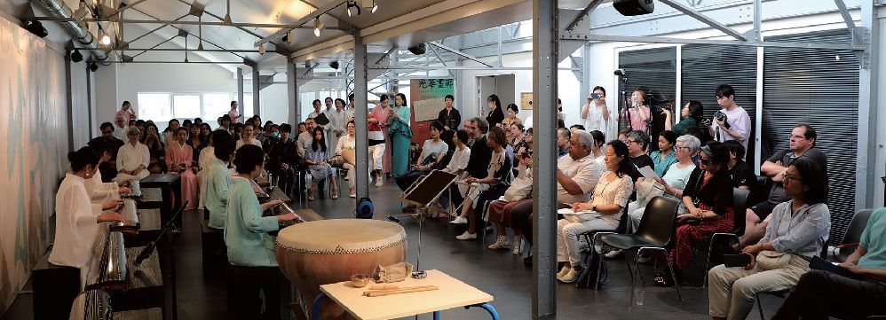 当天,旅法古琴演奏家、宁心琴院院长杨丽宁,中央音乐学院古琴专业副教授、紫霞雅乐团团长赵晓霞,携中法三十余位学生共同带来横跨古今的十二首古琴曲目,远至春秋时期、近至二十世纪七十年代。辅以鼓罄,一抹一挑中穿梭三千年古琴文化、一猱一绰里演绎古人的欢愉与寄托。