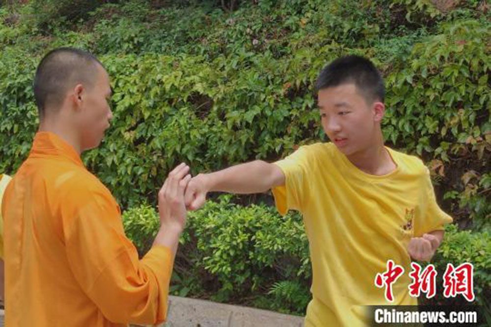 华裔青少年在泉州少林寺体验南少林武术招式。(图片来源:中新网)