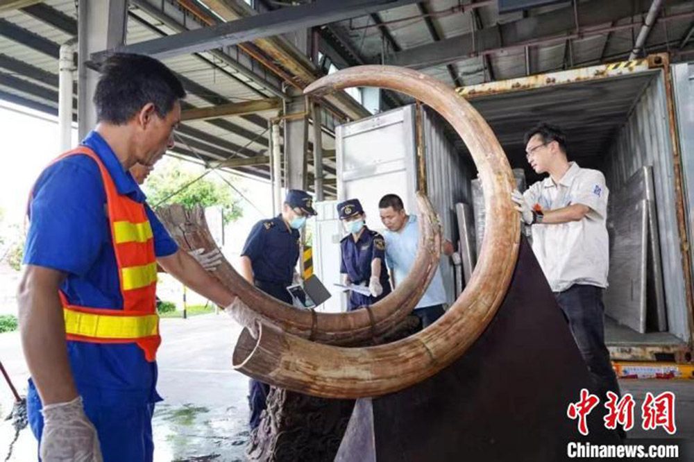 厦门海关正在查验猛犸象牙化石。(图片来源:华侨博物院供图)