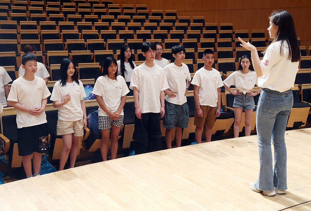 2023年7月28日,夏令营“比赛班”选手们在中国音乐学院老师的带领下进行声乐气息训练。