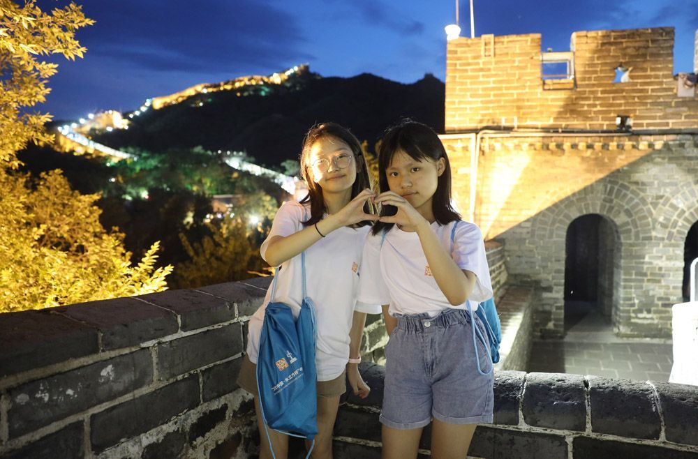 2023年“文化中国·水立方杯”中文歌曲大赛总决赛结束后,音乐夏令营于8月2日正式开始,百余名营员走进北京天坛、长城、故宫等名胜古迹参观游览,打卡北京延庆冬奥园区、水立方/冰立方,实地感知中国文化。图为2023年8月4日,法国赛区青少组选手袁一诺(左)、管琪乐在夜游八达岭长城时一起摆造型合影。(图片来源:本文图片均据欧洲时报特约记者卞戈摄)